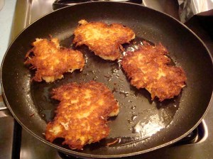 • Measure the mixture with an ice cream scoop to make uniform latkes that will cook evenly. Remember, the smaller they are the crispier they will be.