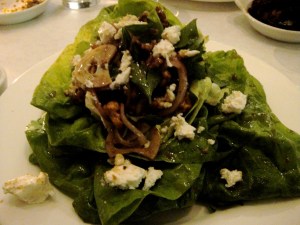 First course, Modena salad. Salad of butter lettuce, candied walnuts, crumbled goat cheese, shallots, fresh herbs drizzled with a creamy balsamic vinaigrette. This was a nice salad but a bit overwhelming because it was large, difficult to eat and the cheese overpowered the more delicate flavors.