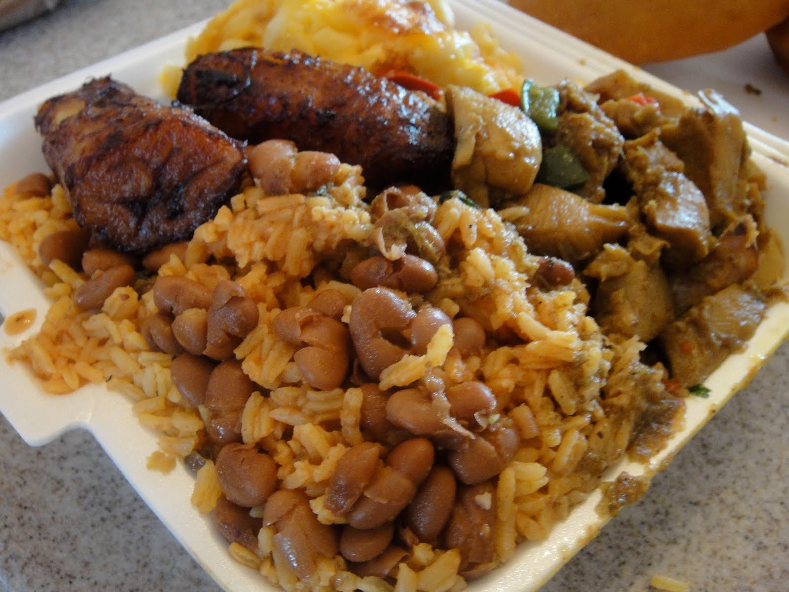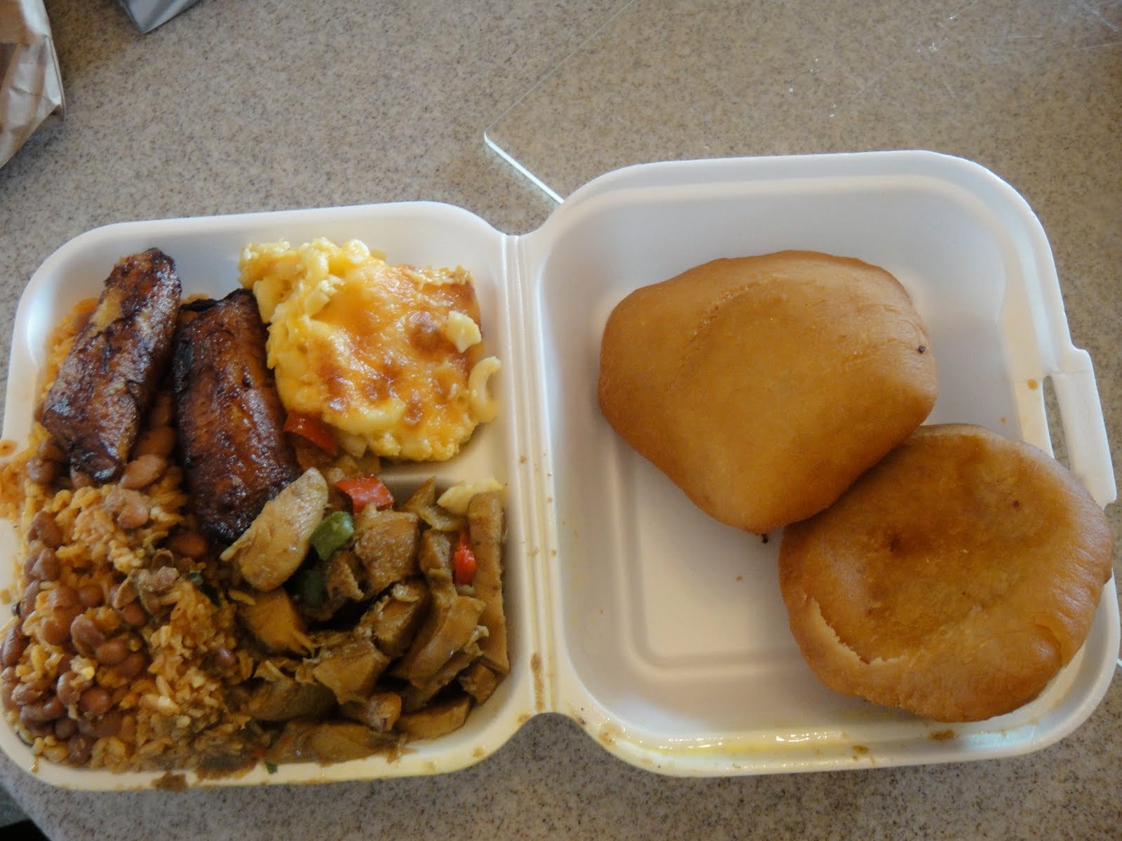 A local plate lunch of rice and beans, macaroni and cheese, stewed conch, fried sweet plantains, and johnny cakes which are fried cornmeal flatbreads.