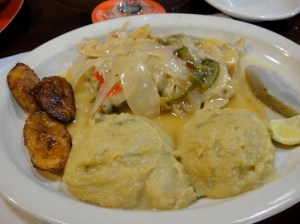Conch in garlic butter with a side of sweet potato, plantains and fungi- a cornmeal mush