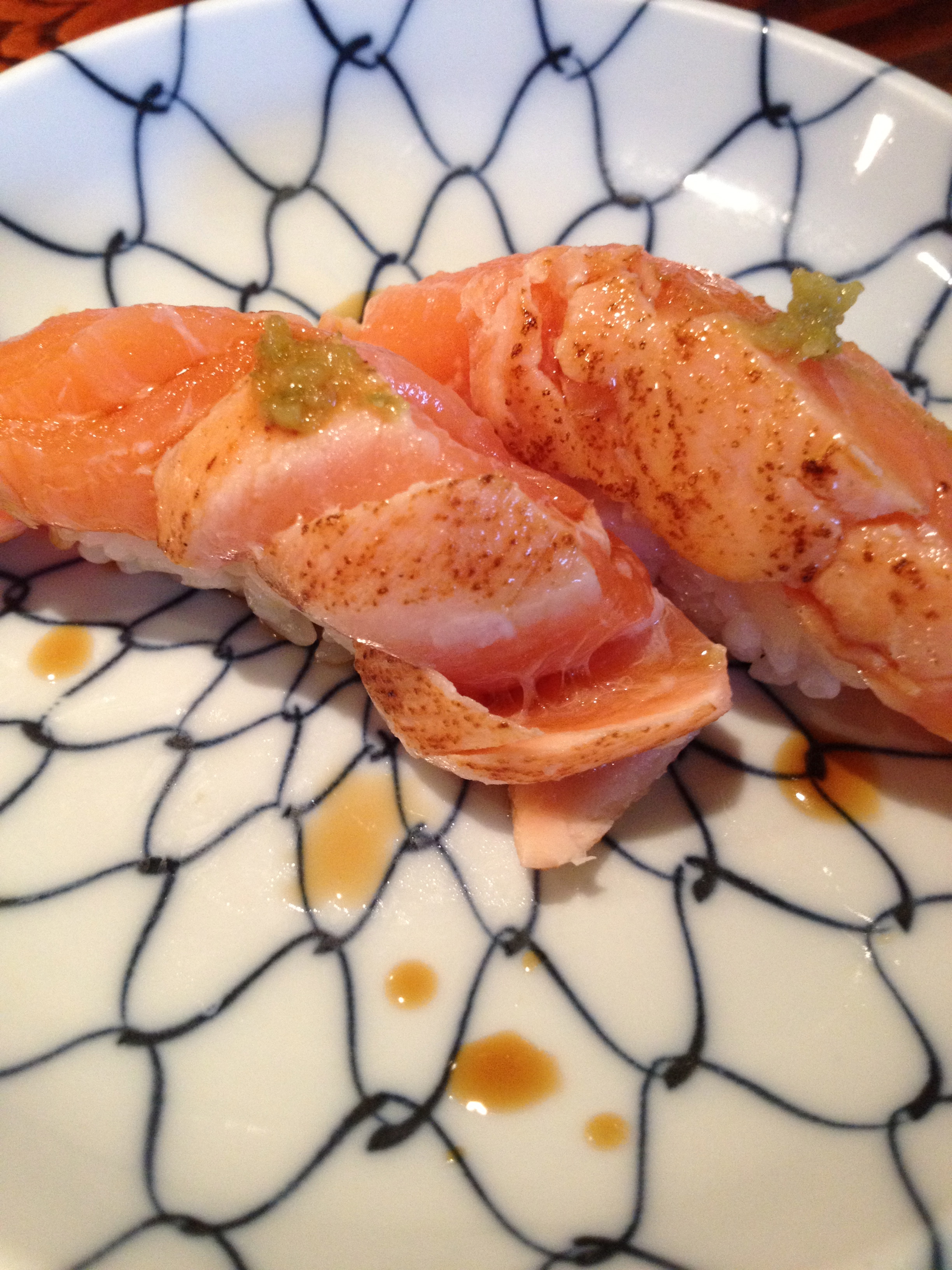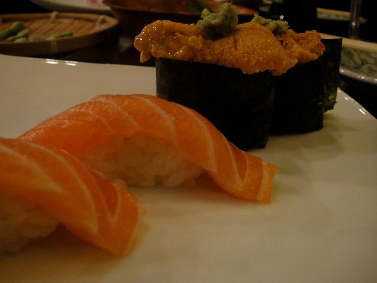 Buttery salmon sushi with creamy, mouthwatering UNI. Look at the way it drips over the edge. Ooooooh sooooo tasty. I’m drooling