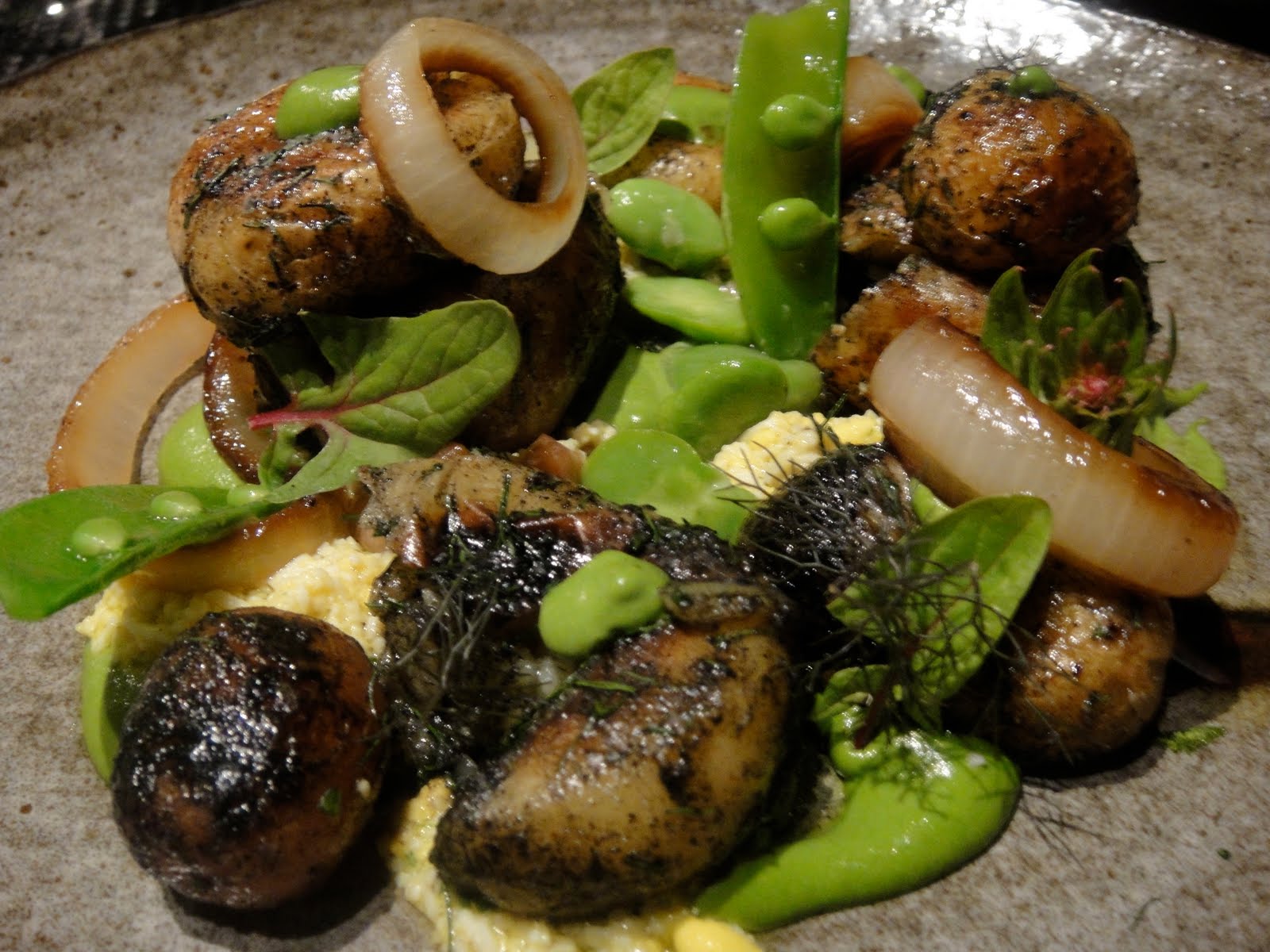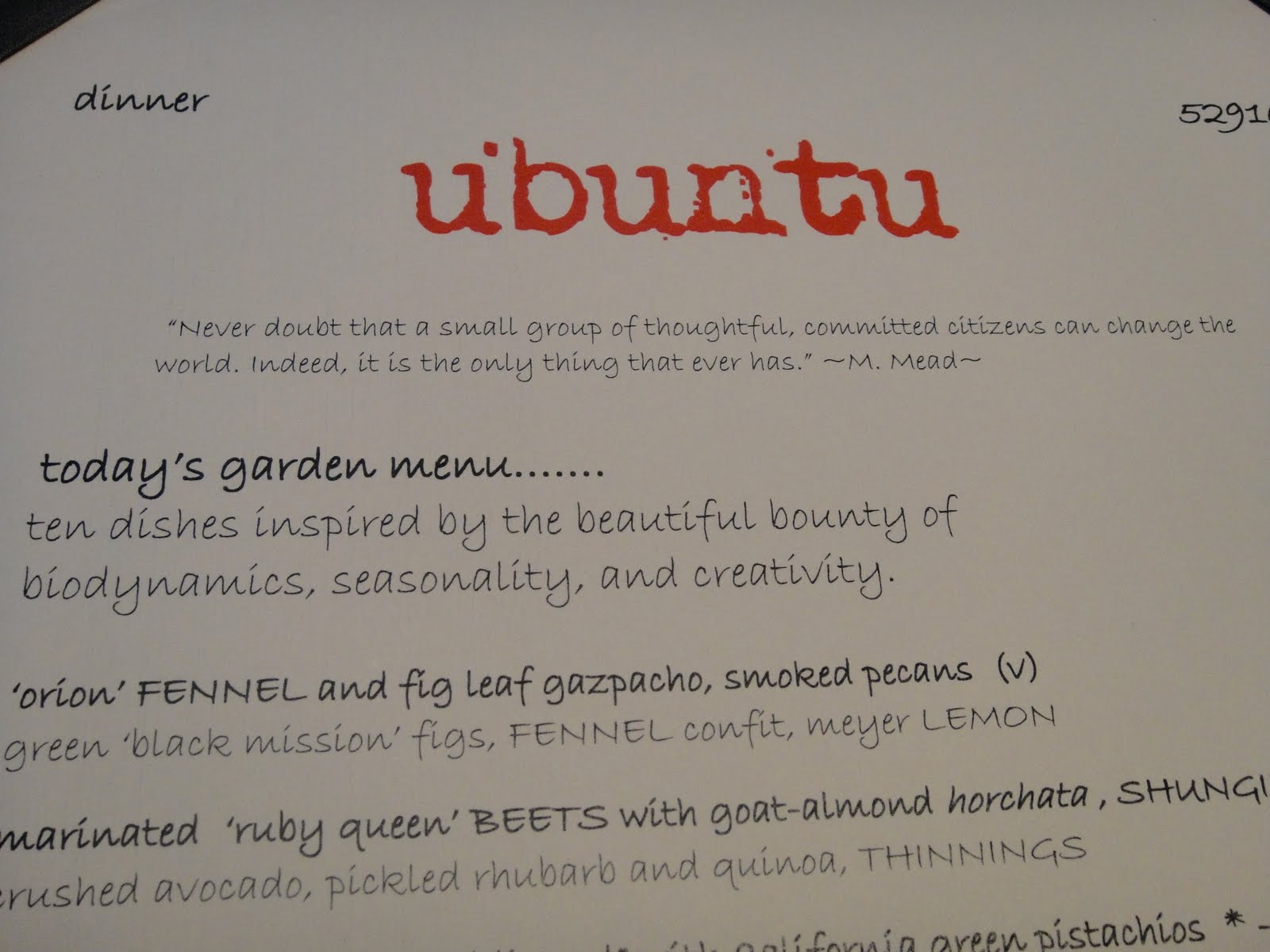 Flash forward to Ubuntu. I’m not sure if you can read the menu below but let me help you. MENU ITEM EXAMPLE: Arbuckle grits, slowly cooked with goats why, salsa MARO spezzato fresh ricotta, blackened and braised FAVAS, lavender mint.