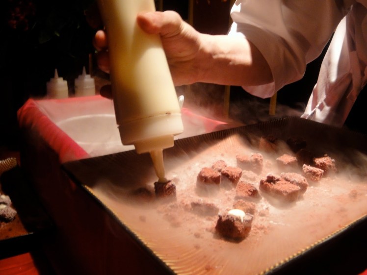 Red Velvet Cake Dipped in Liquid Nitrogen (which freezes the cake and makes it cold and crunchy)
