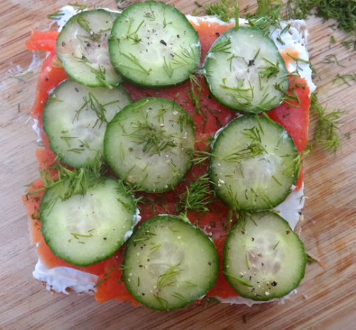 Soften the cream cheese by putting it in the microwave for 10 seconds. Cut the crust off of your sliced bread. Spread the cream cheese on both slices of bread. Top one side with cucumbers, smoked salmon or both. Sprinkle dill and salt and pepper to taste. Place the other slice of bread on top and cut into cute small rectangle or triangle shapes. Enjoy your brilliant creation with a cup of tea, (pinky out).