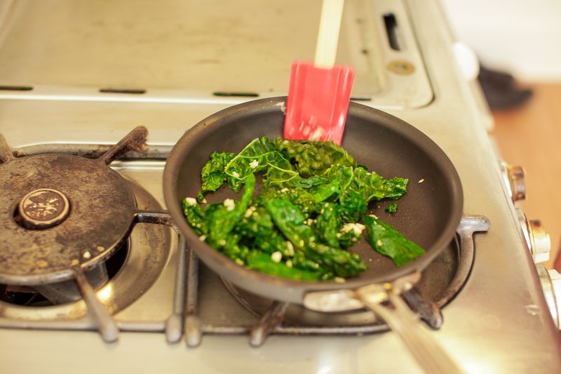 Spread each slice of bread with half of the cheese. Top with kale mixture, dividing evenly.
