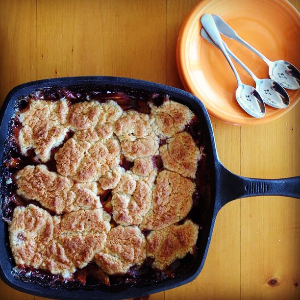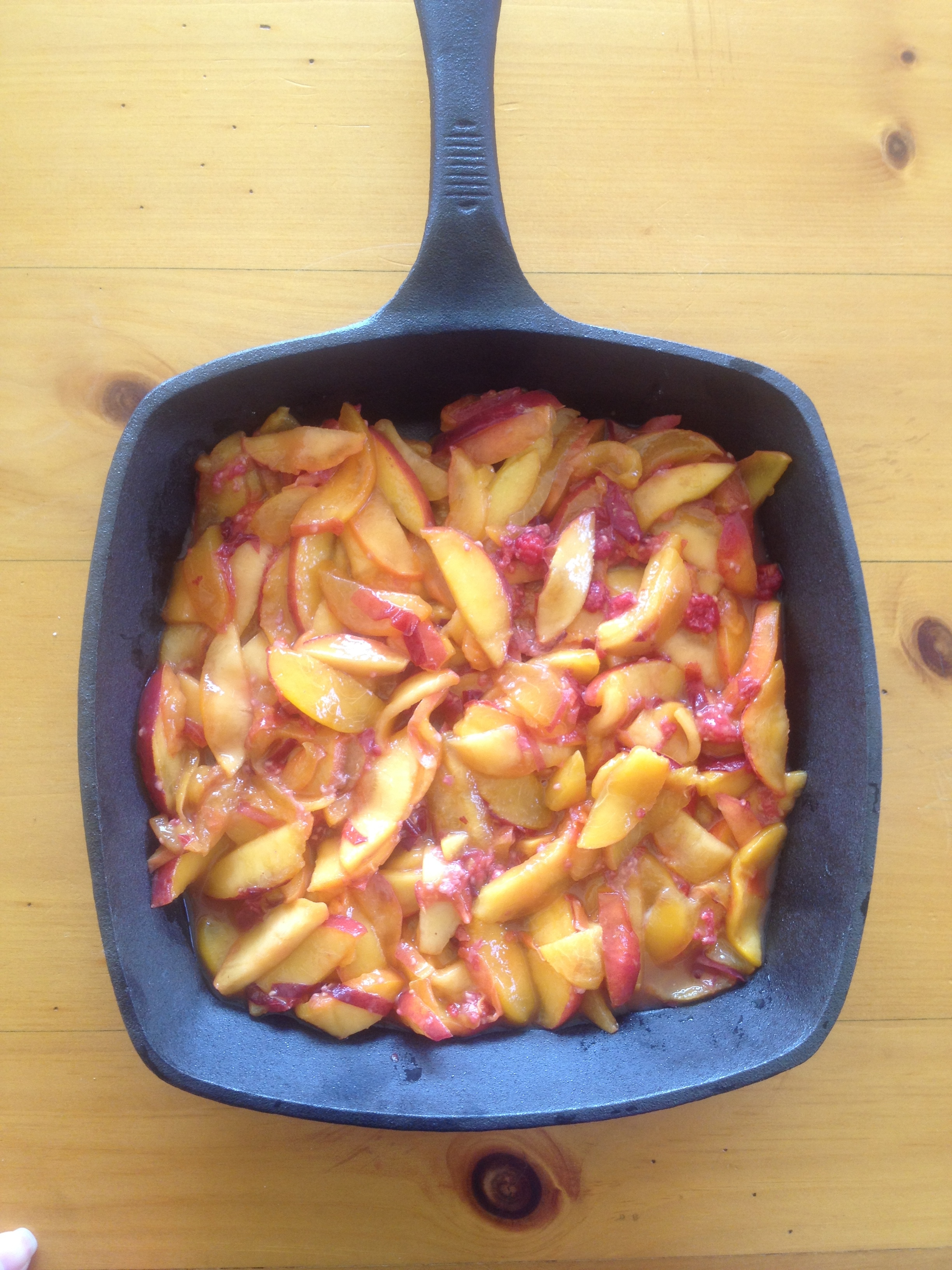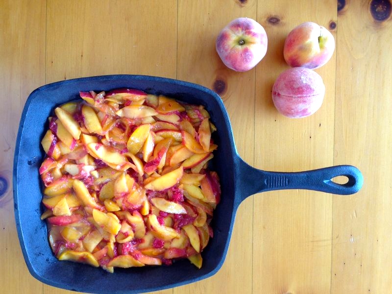 I used this simple peach cobbler recipe and decided to bake it in a cast iron skillet for a rustic touch. I was staying in a cabin in the woods after all. As mentioned, I added a cup of wild raspberries and 2 additional peaches to the mix and the result was nectarous. The biscuit topping is not too sweet which is why I’m such a fan of this recipe.